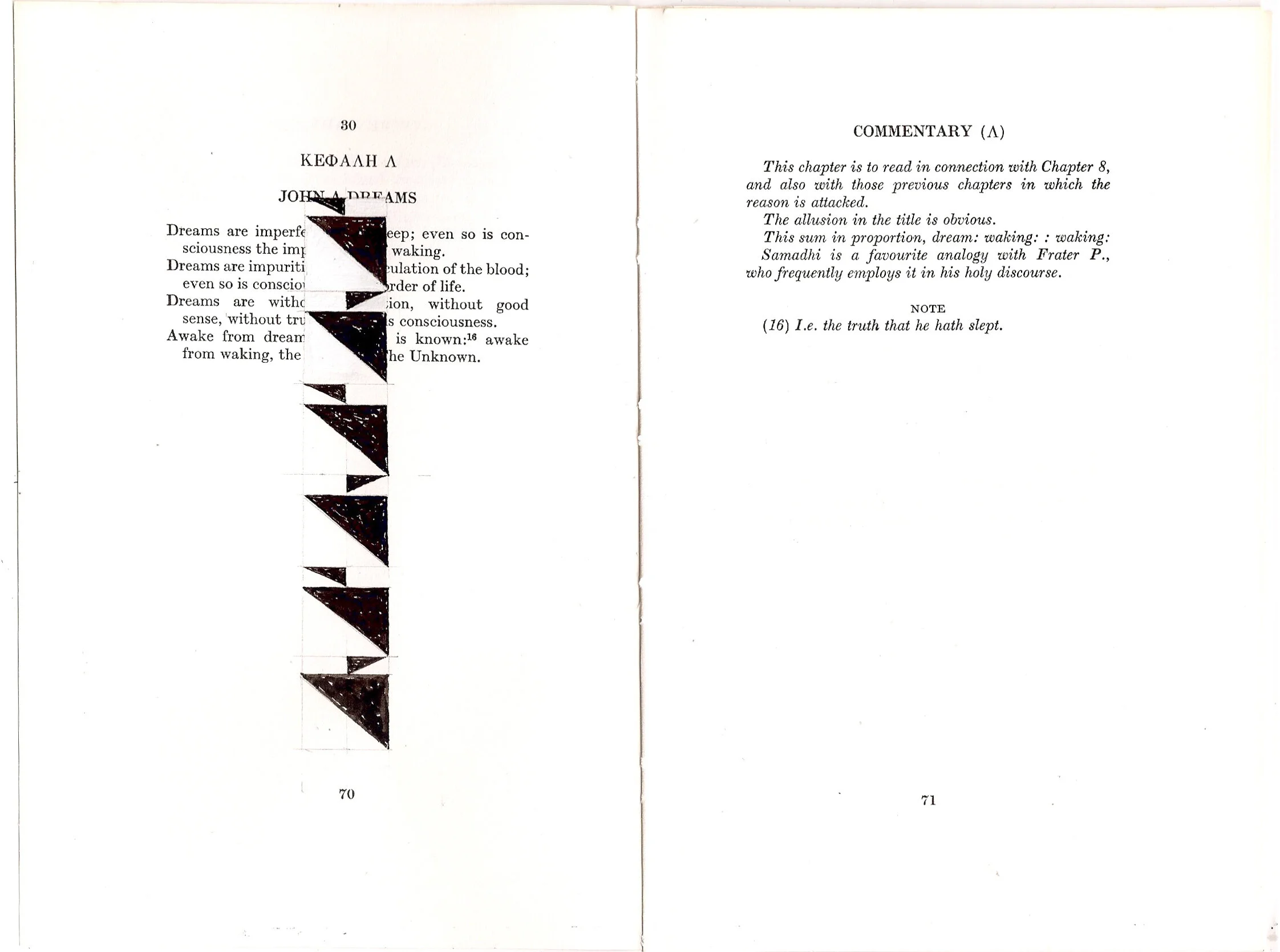 Gouache and Graphite on selected pages from Aleister Crowley’s The Book of Lies. Published 1912